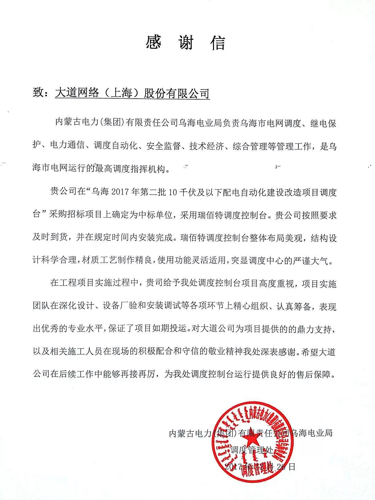 12月26日,內蒙古電力(集團)有限責任公司烏海電業局向大道公司發來感謝信,對大道公司在2017年承建的烏海調度控制臺采購項目中瑞佰特控制臺產品的優秀表現、大道公司強大的供應鏈支持以及專業的服務表示高度的認可和贊譽。