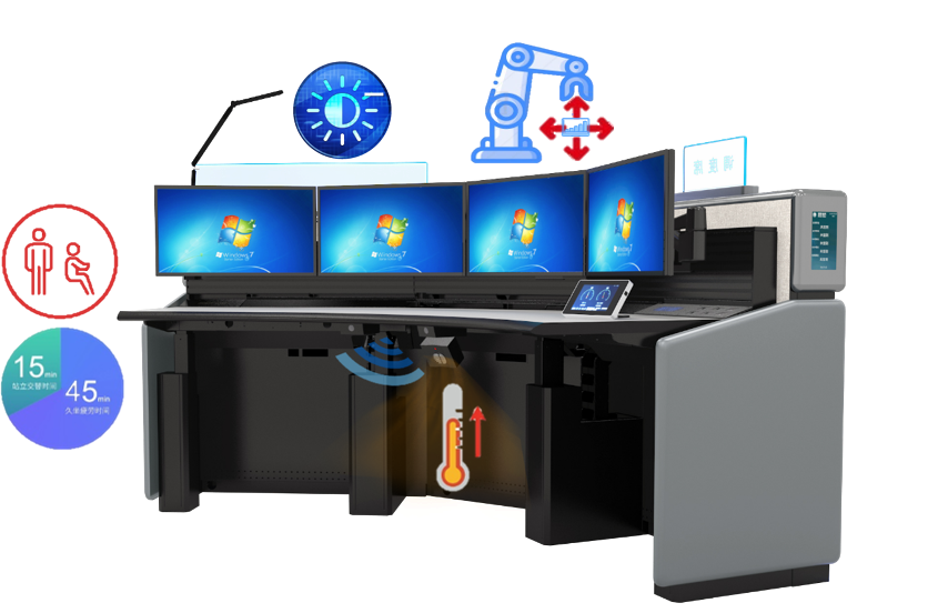 瑞佰特智慧控制臺通過人機工學態勢感知模塊智能提醒使用者采用正確的辦公姿態,例如通過全電控桌面高度調整功能適時切換站姿和坐姿辦公,通過全電控顯示器姿態調整模塊調整顯示器的空間位置來匹配最佳的視角和視距等。配置的智慧環境感知模塊不但能自動調整桌面工作燈的照度以提供最科學健康的用眼環境,還能智能感應并調整使用者腿部感知舒適度。通過這一系列智慧化模塊的協同作用,全方位保障了用戶在辦公過程中的舒適與健康。