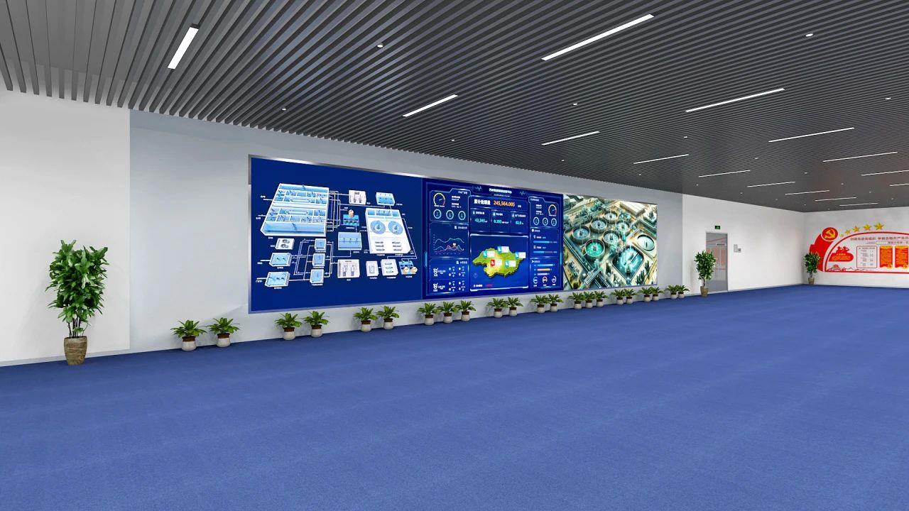 大道公司在這座科技與自然和諧共生的水質凈化廠中,精心建設并投運了兩套大屏幕顯示系統,共同繪就綠色智慧低碳發展的新篇章。在智慧控制中心,一套大道公司0.9點間距、約21.3㎡的微弧度全倒裝COB大屏赫然在目,其9600×2520的全屏高清分辨率,讓進出水在線儀表集中可視化顯控平臺、大數據三維可視化智慧運營平臺以及智慧生產管理可視化平臺得以同時清晰展現。而在企業展廳,另一套大道公司1.25點間距、約45.6㎡的全倒裝COB大屏同樣引人注目。這塊大屏以12000×2430的超高全屏分辨率,生動展示了三維可視化企業運行數據等匯報展示內容,成為水廠對外接待展示的重要窗口。